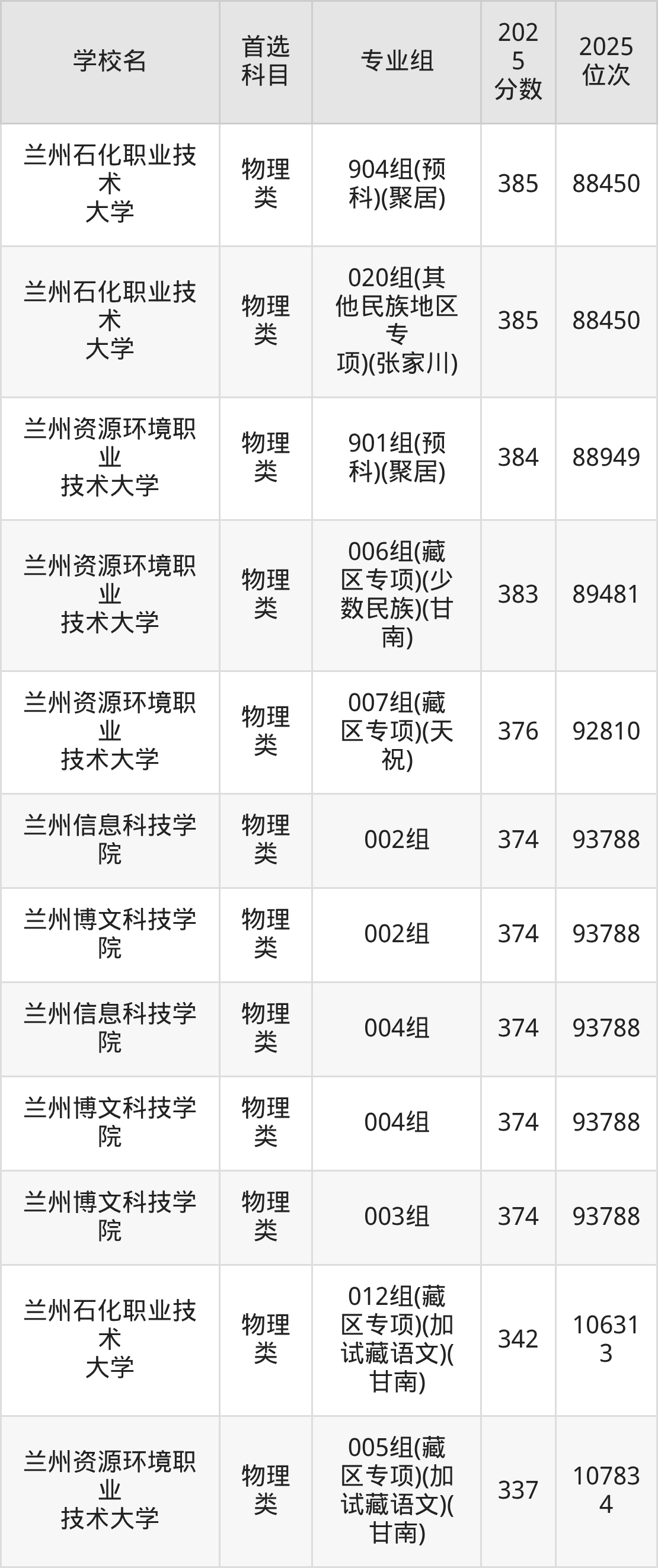 (3)兰州博文科技学院003专业组:374分、93788名;