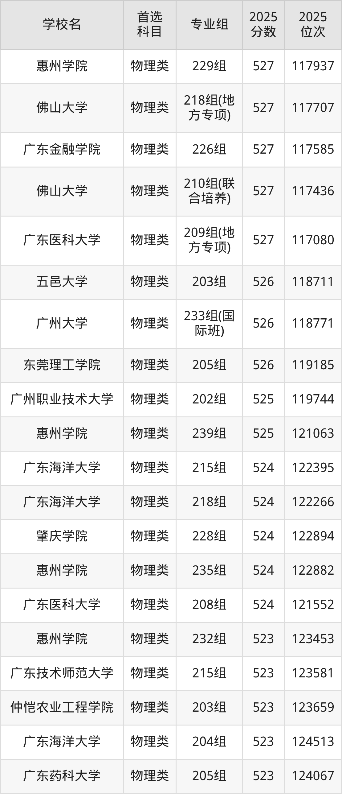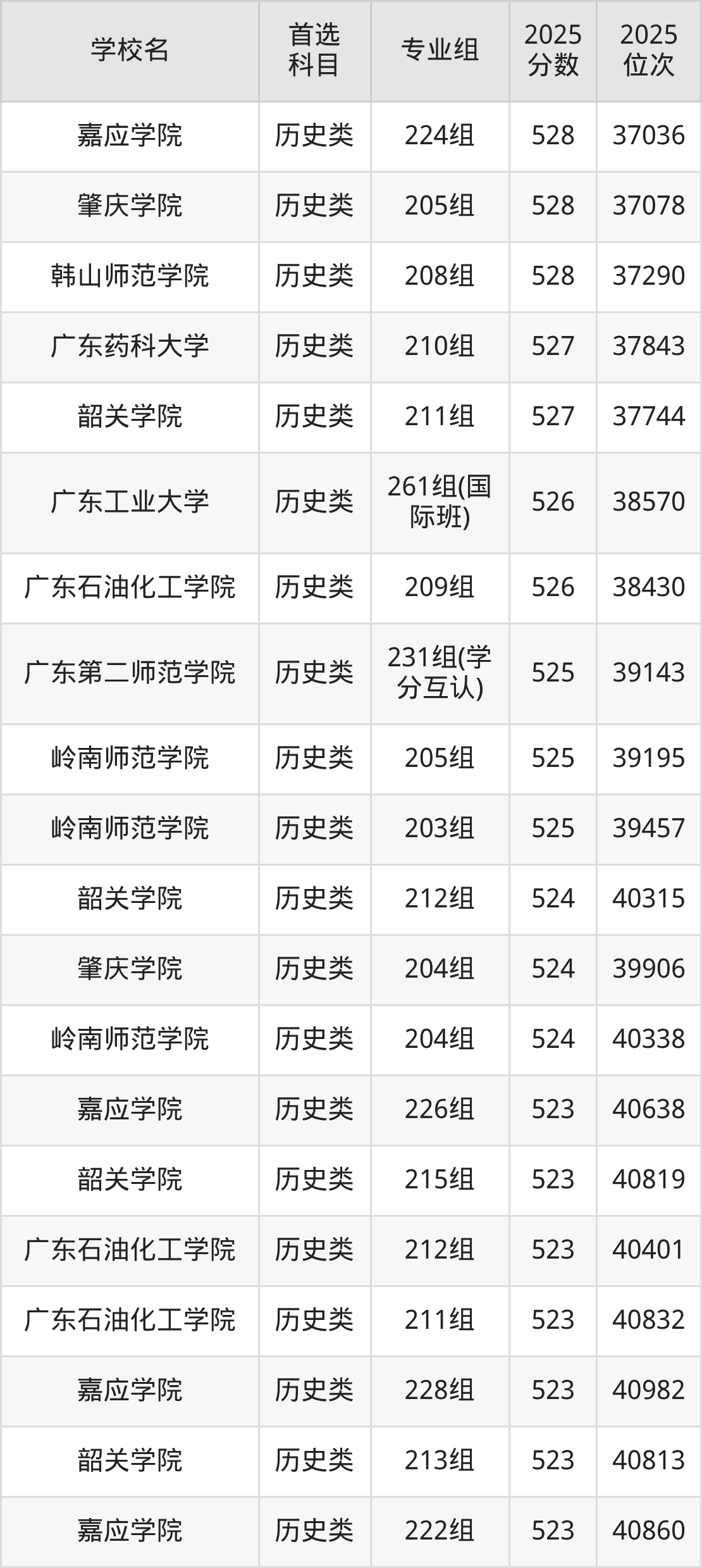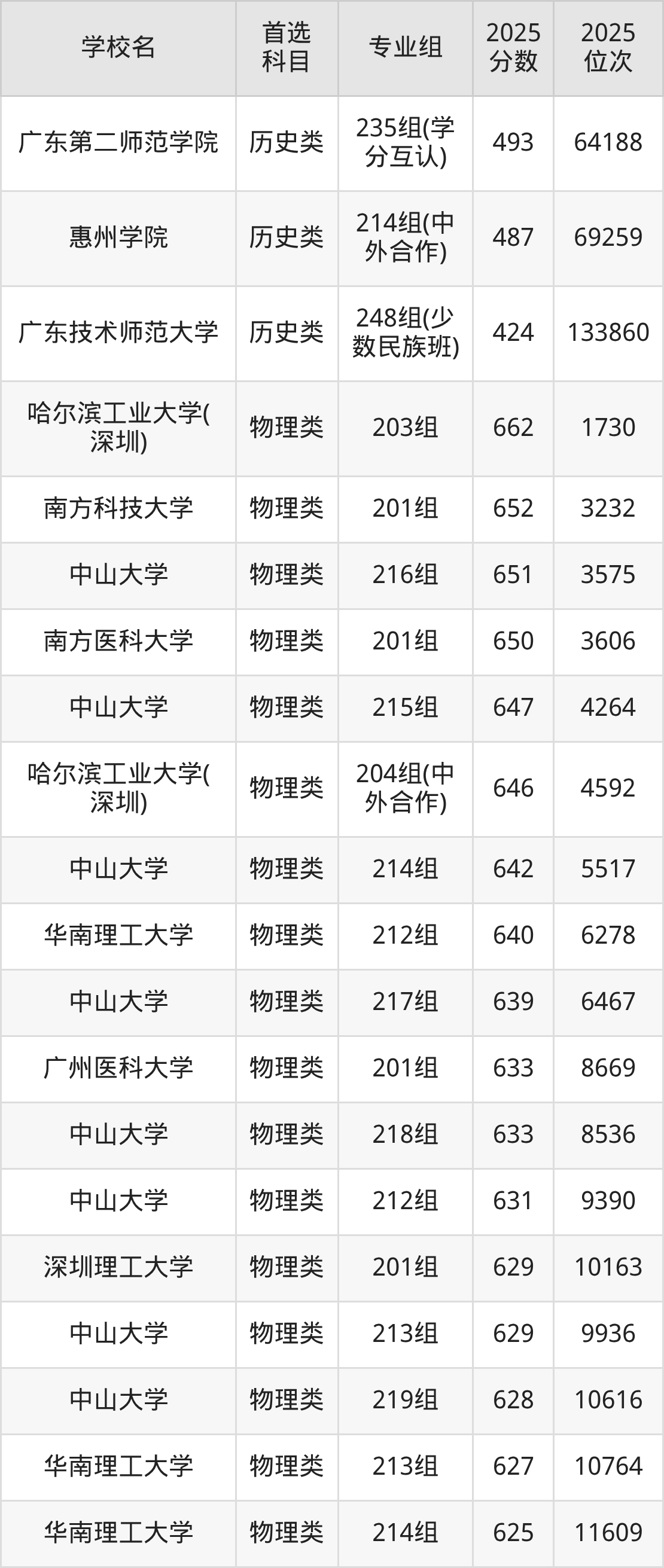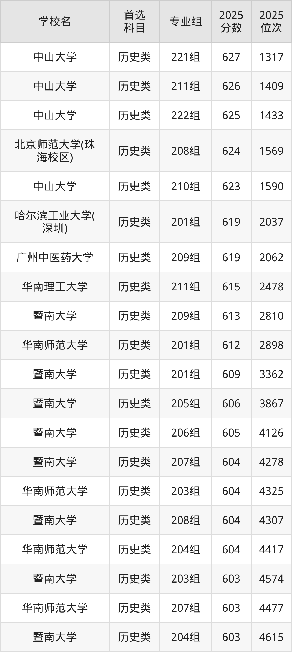 2025年一共有42所公办本科在广东历史类招生,包含了243个专业组,录取分数线从424分到627分不等,对应最低位次从133860名到1317名。下面分别展示广东省分数线最高、最低的五个院校专业组。