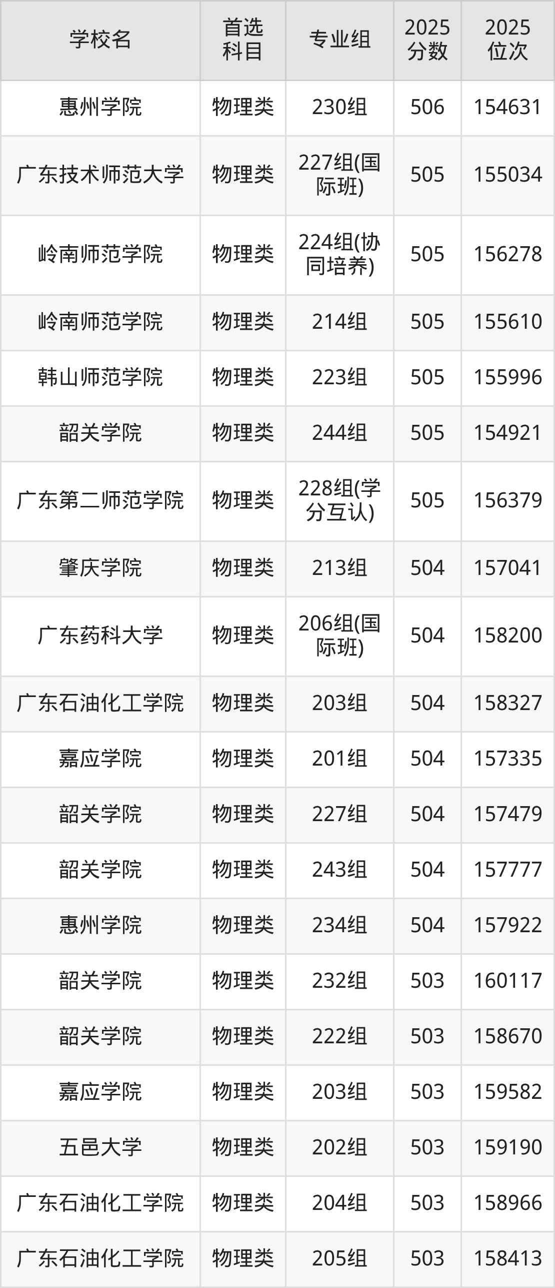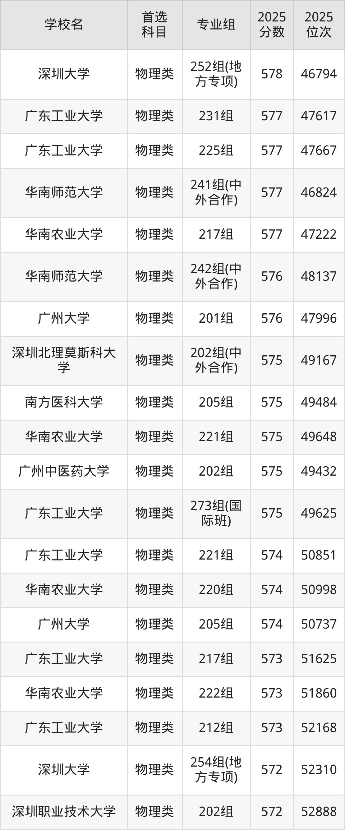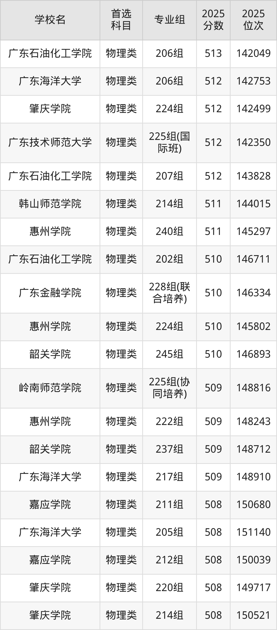 2025年一共有50所公办本科在广东物理类招生,包含了558个专业组,录取分数线从425分到662分不等,对应最低位次从292533名到1730名。下面分别展示广东省分数线最高、最低的五个院校专业组。