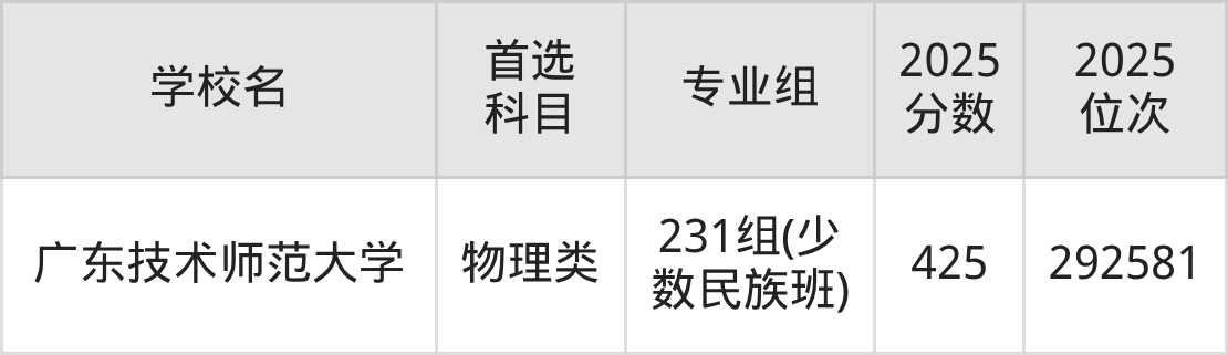 (5)广东技术师范大学231组(少数民族班):425分、292581名;