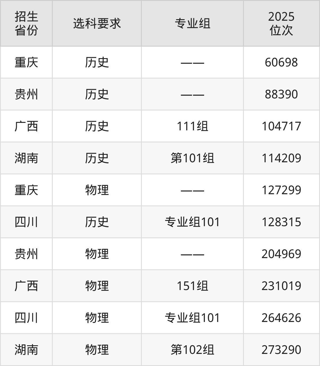 毕节工业职业技术学院2025年在全国各省的位次差异较大,最高位次是60698位(重庆历史类)、最低位次是273290位(湖南物理类)。各省具体位次请看下图: