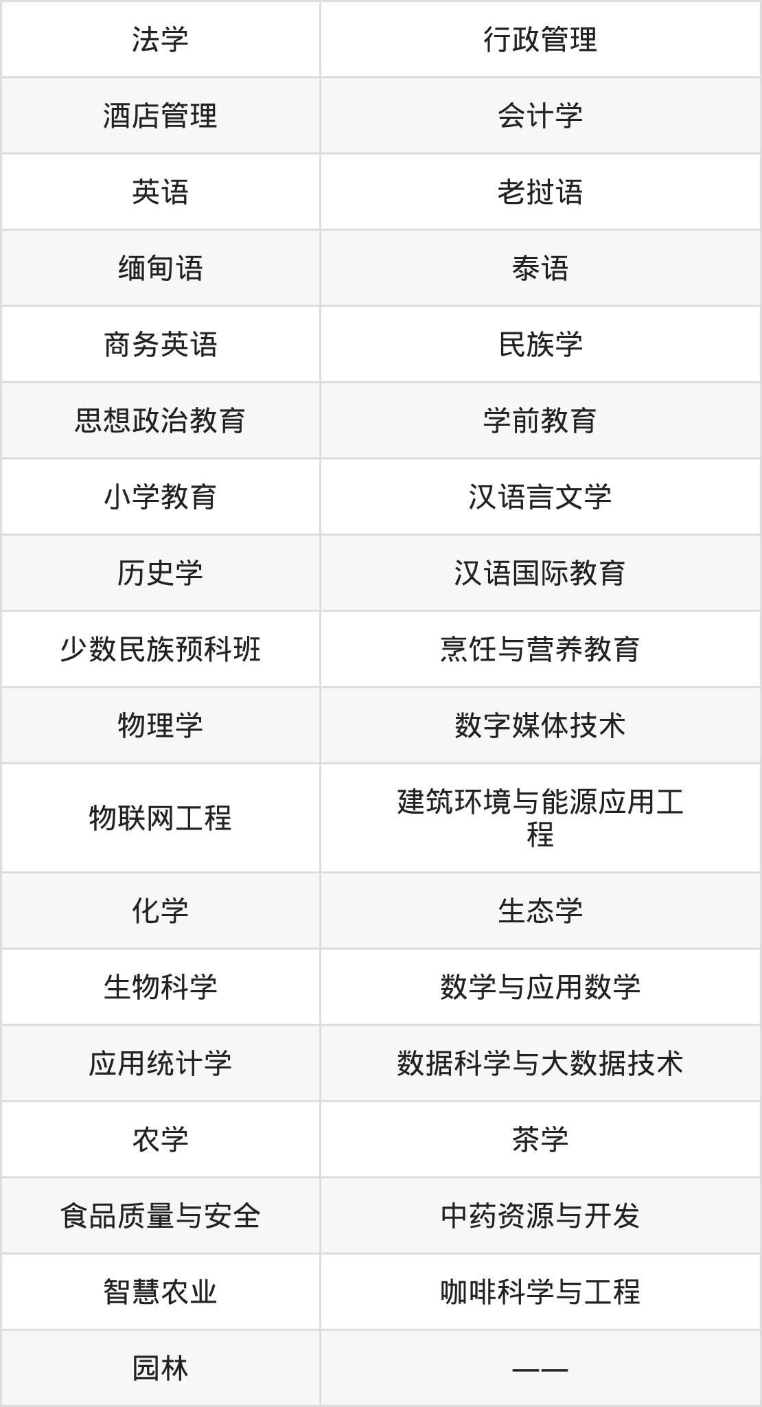 根据2025年云南高考招生计划可知,普洱学院招生专业包含法学、行政管理、酒店管理等,完整版名单如下。