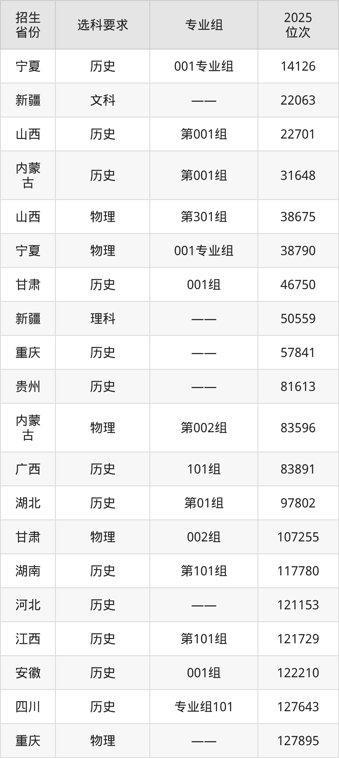铜川职业技术学院2025年在全国各省的位次差异较大,最高位次是14126位(宁夏历史类)、最低位次是454514位(山东)。各省具体位次请看下图: