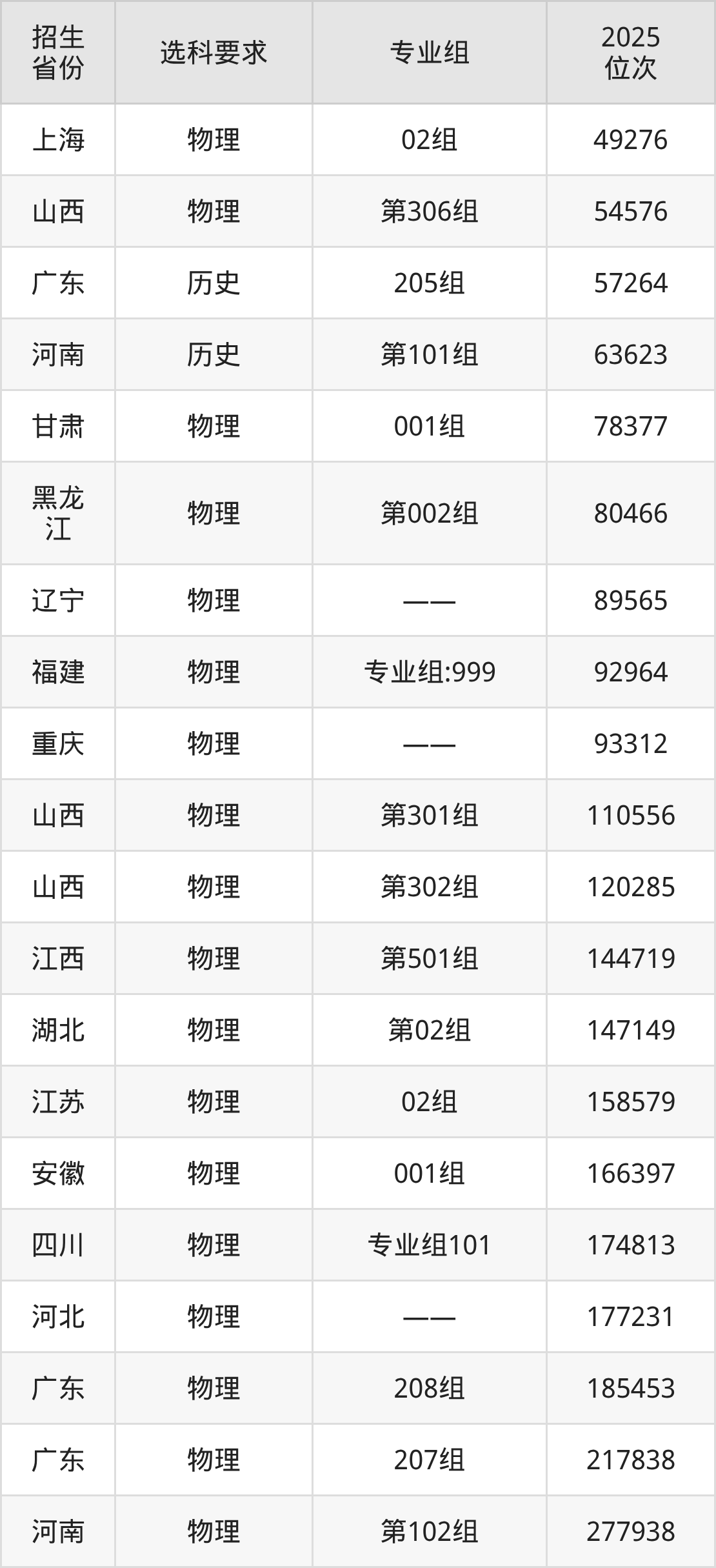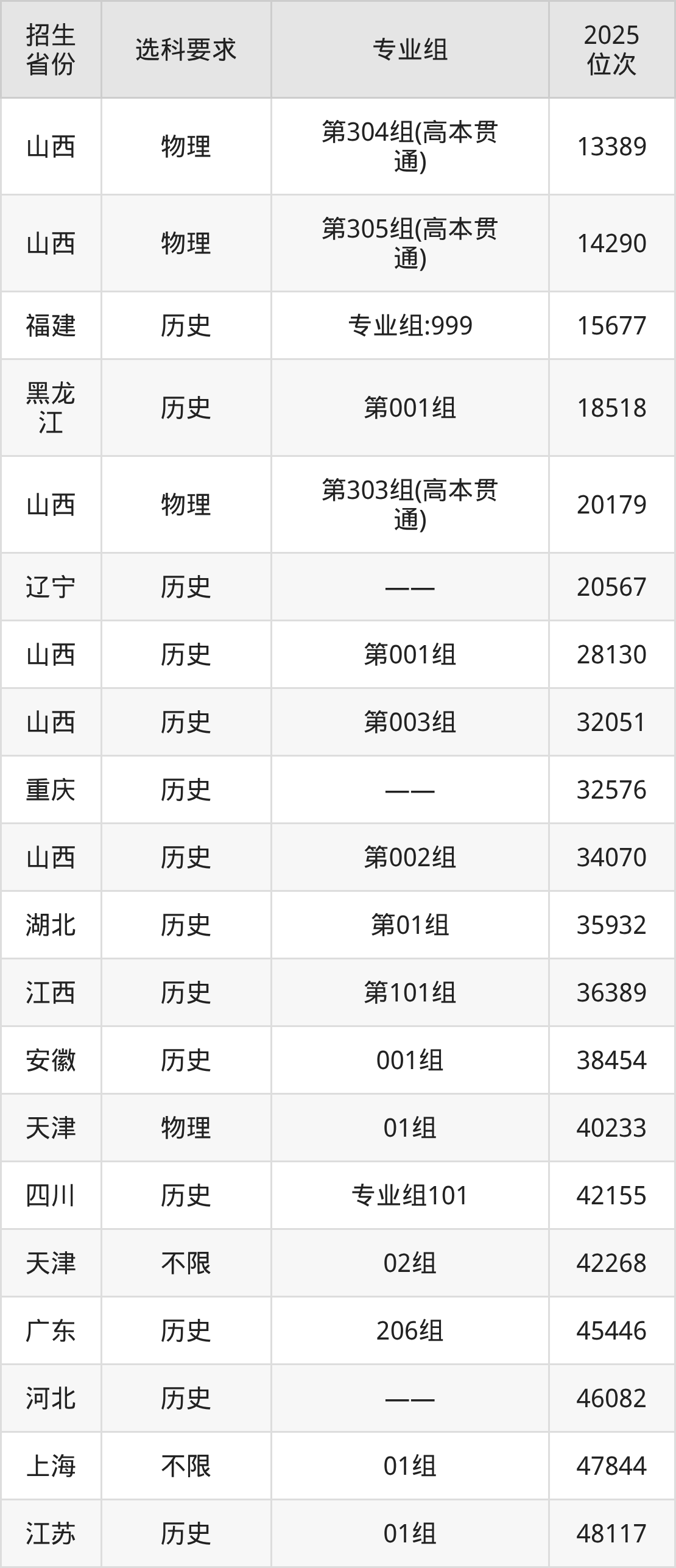 运城职业技术大学2025年在全国各省的位次差异较大,最高位次是13389位(山西物理类)、最低位次是311290位(山东)。各省具体位次请看下图: