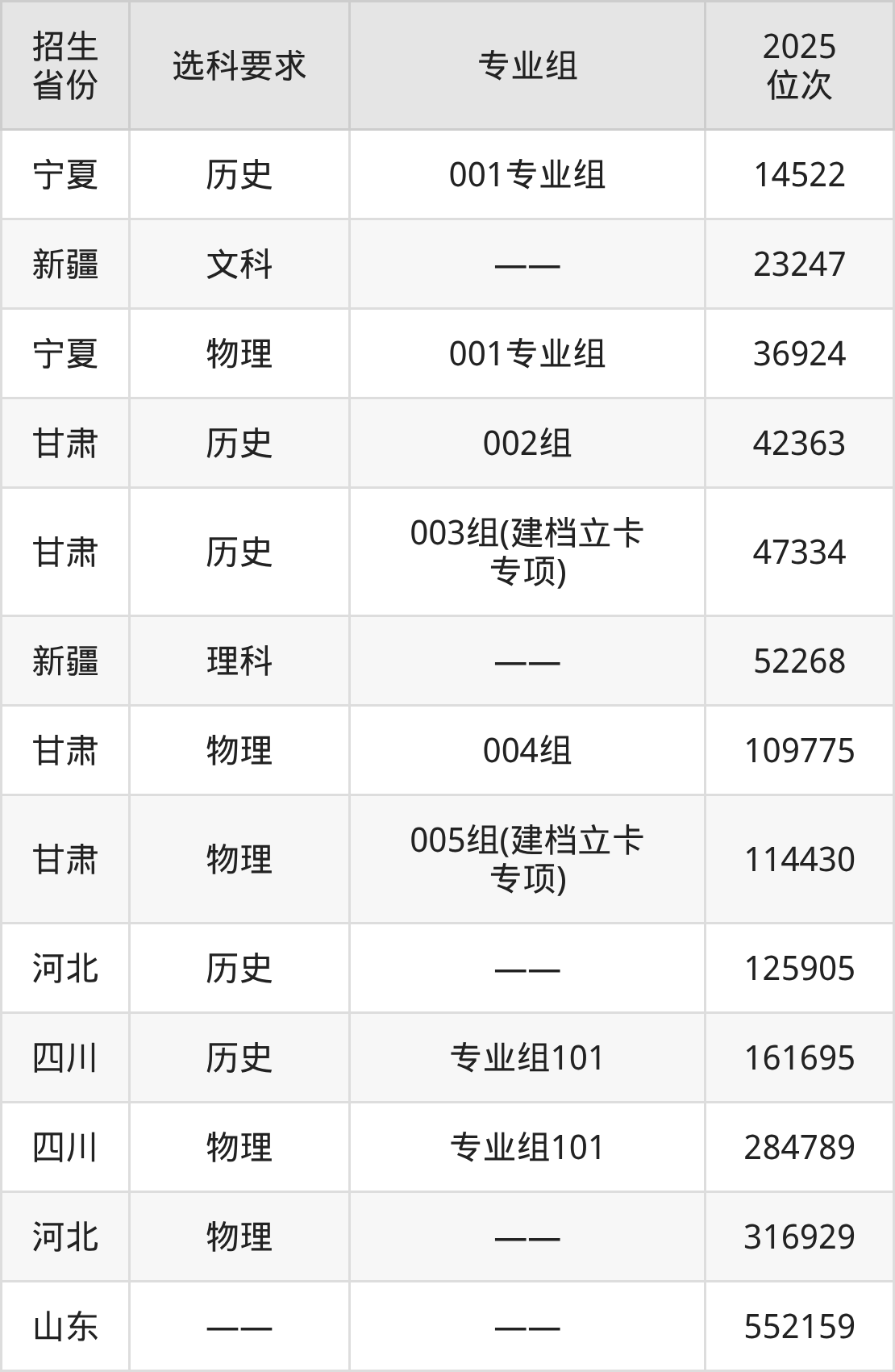 甘肃财贸职业学院2025年在全国各省的位次差异较大,最高位次是14522位(宁夏历史类)、最低位次是552159位(山东)。各省具体位次请看下图: