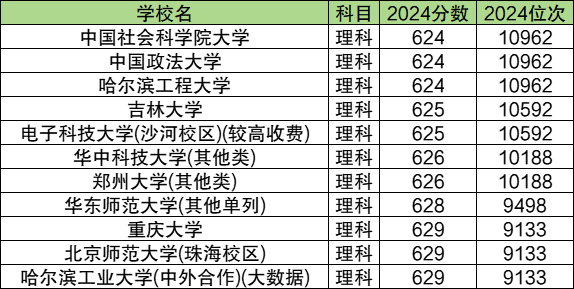 位次在10000左右的基本属于985或实力较强的211院校,分数在624-629分之间,比一本线高113-118分。其中位次相对靠后的有中国社会科学院大学、中国政法大学、哈尔滨工程大学、吉林大学。