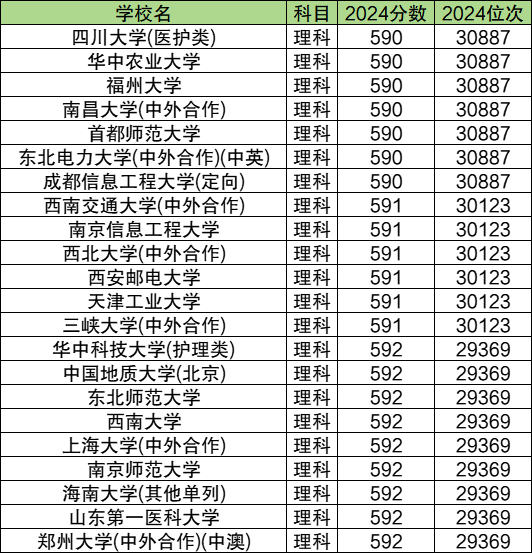 位次在30000左右的基本属于211或省重点院校,分数在590-592分之间,比一本线高79-81分之间。其中位次相对靠后的有四川大学(医护类)、华中农业大学、福州大学、南昌大学(中外合作)、首都师范大学。