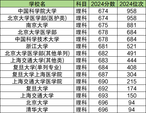 位次在1000以内的院校共有11个,能读的基本都是顶尖985院校,其中较为好考的有中国科学院大学、北京大学医学部(医护类)、南京大学,这些院校的分数在674-675分之间,位次在881以内。