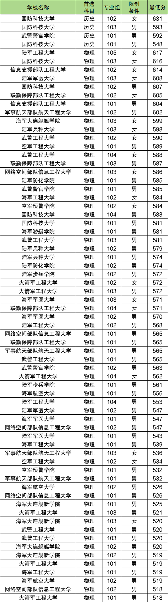 在女生的录取中,历史类最低需要631分、物理类最低需要520分。前者对应国防科技大学102组、后者对应海军大连舰艇学院103组。