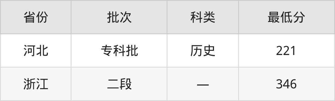 明达职业技术学院汽车技术服务与营销专业录取分数线从221分到346分不等,最低分数线如下: