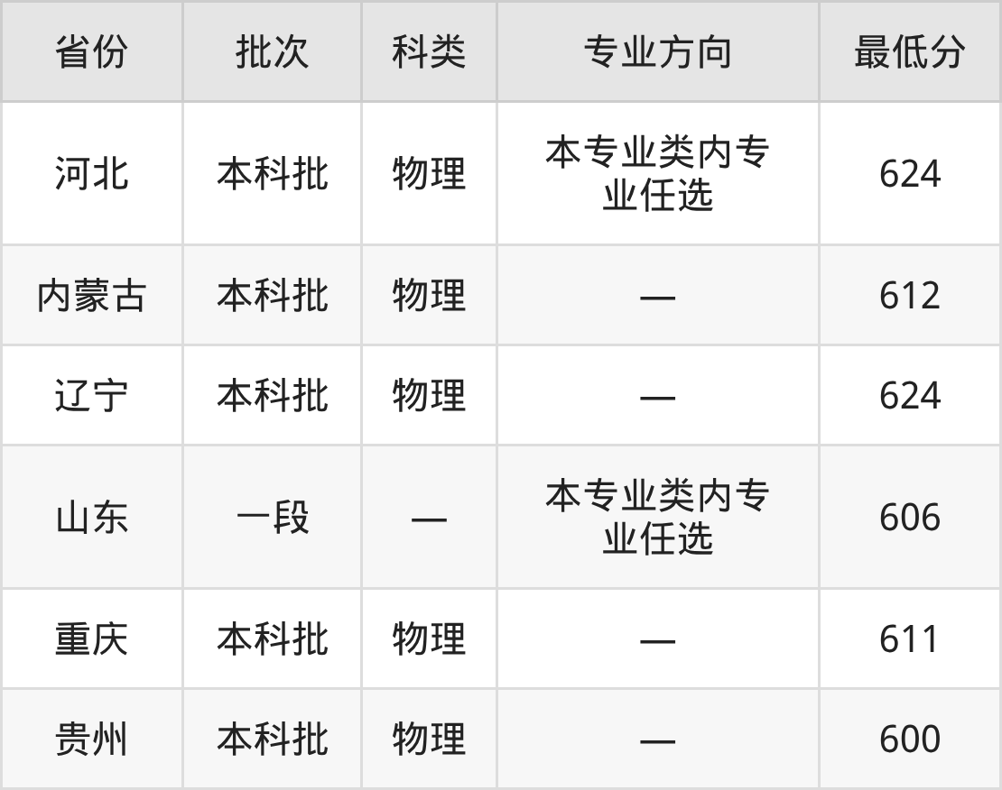 中南财经政法大学统计学类专业在全国各省最低录取分数线为600分(贵州物理类),除此之外,在其余地区的最低分为辽宁物理类624分、山东606分、重庆物理类611分、河北物理类624分等,以上数据均为2025年数据,供2026年高考生参考。