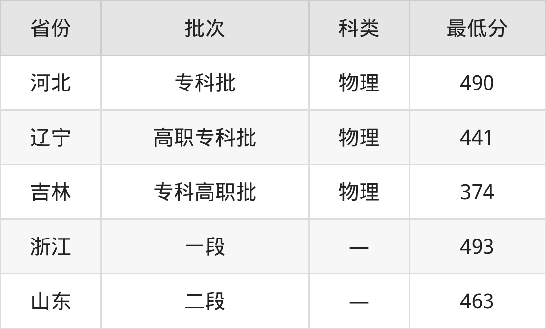 黄河水利职业技术大学机电一体化技术专业在全国各省最低录取分数线为374分(吉林物理类),除此之外,在其余地区的最低分为河北物理类490分、辽宁物理类441分、浙江493分、山东463分,以上数据均为2025年数据,供2026年高考生参考。