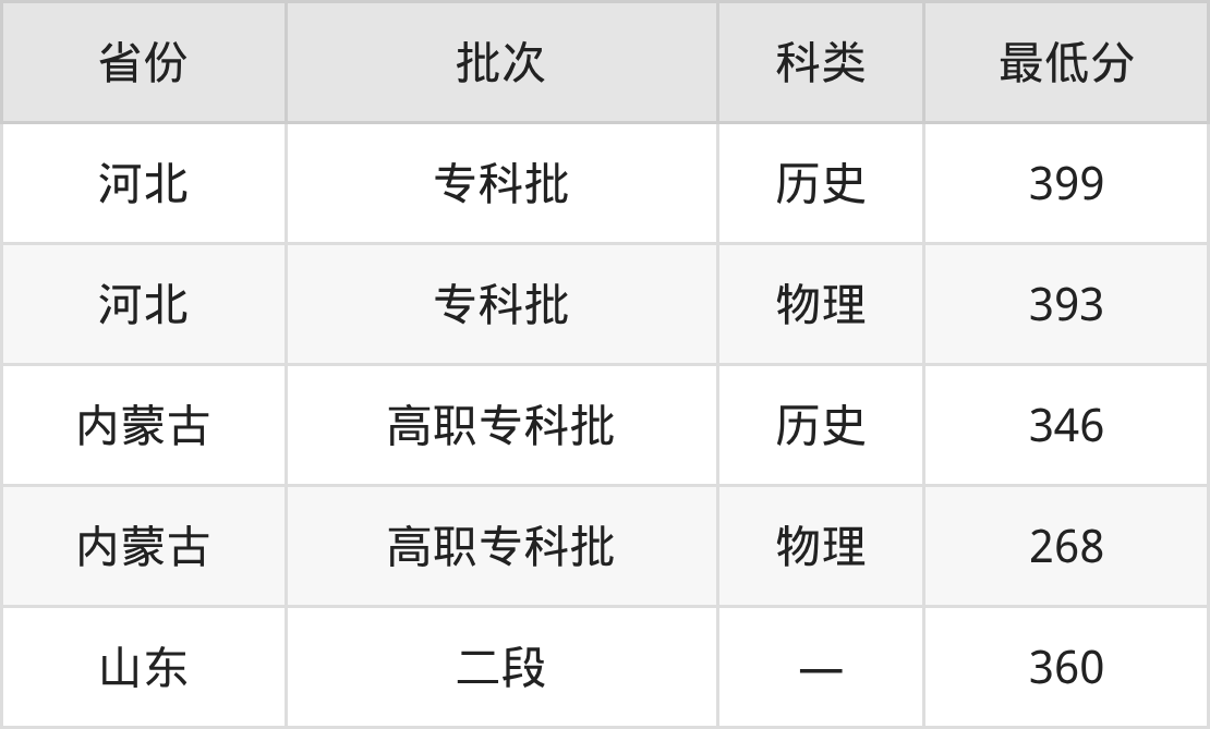 河北资源环境职业技术学院工程地质勘查专业在全国各省最低录取分数线为268分(内蒙古物理类),除此之外,在其余地区的最低分为河北物理类393分、山东360分,以上数据均为2025年数据,供2026年高考生参考。