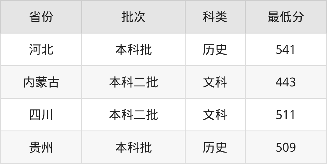 闽江学院文物与博物馆学专业在全国各省最低录取分数线为443分(内蒙古文科),除此之外,在其余地区的最低分为河北历史类541分、四川文科511分、贵州历史类509分,以上数据均为2024年数据,供2025年高考生参考。