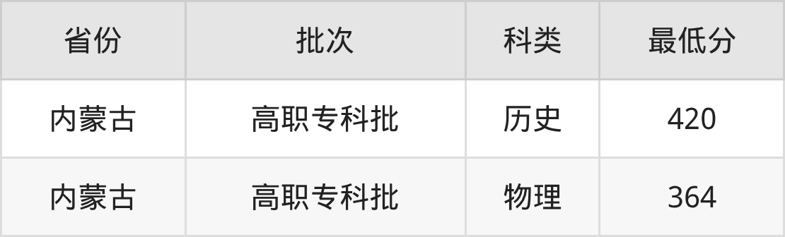 包头铁道职业技术学院城市轨道交通机电技术专业录取分数线从364分到420分不等,最低分数线如下: