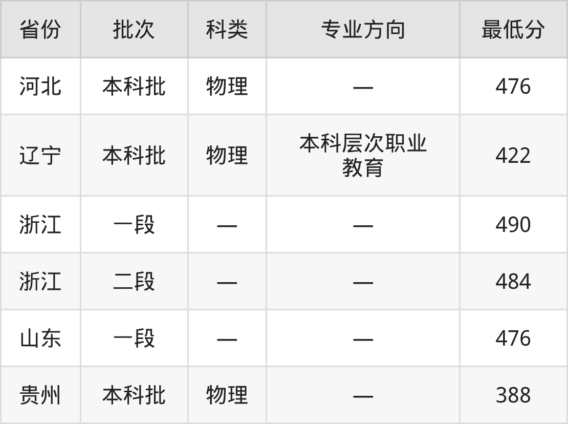 上海中侨职业技术大学物联网工程技术专业在全国各省最低录取分数线为388分(贵州物理类),除此之外,在其余地区的最低分为河北物理类476分、辽宁物理类422分、浙江484分、山东476分,以上数据均为2025年数据,供2026年高考生参考。