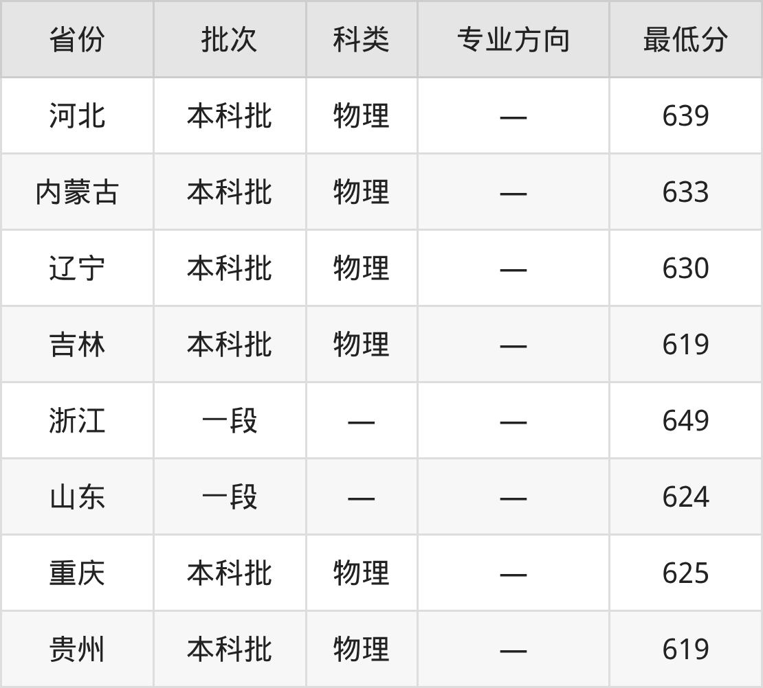 南京理工大学电子信息类专业在全国各省最低录取分数线为619分(吉林物理类),除此之外,在其余地区的最低分为山东624分、重庆物理类625分、贵州物理类619分、河北物理类639分等,以上数据均为2025年数据,供2026年高考生参考。