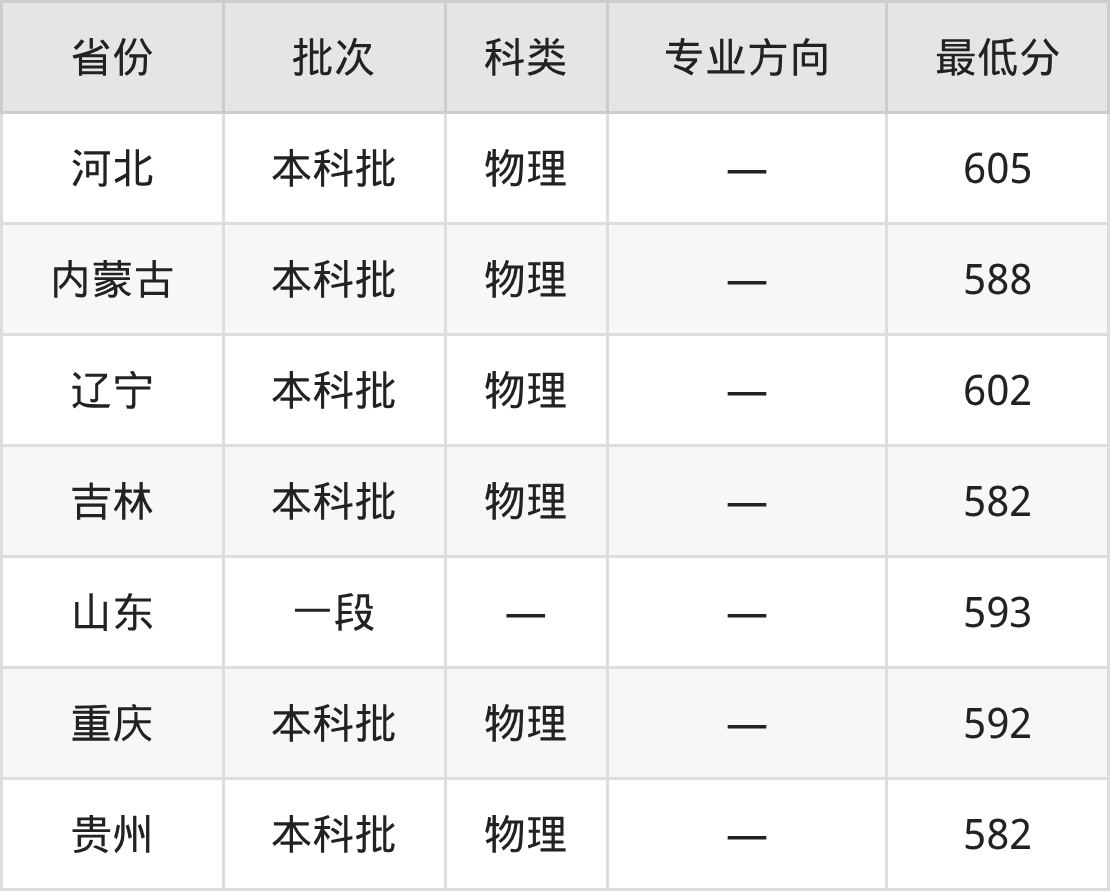 中国矿业大学测绘类专业在全国各省最低录取分数线为582分(吉林物理类),除此之外,在其余地区的最低分为重庆物理类592分、贵州物理类582分、河北物理类605分、内蒙古物理类588分等,以上数据均为2025年数据,供2026年高考生参考。