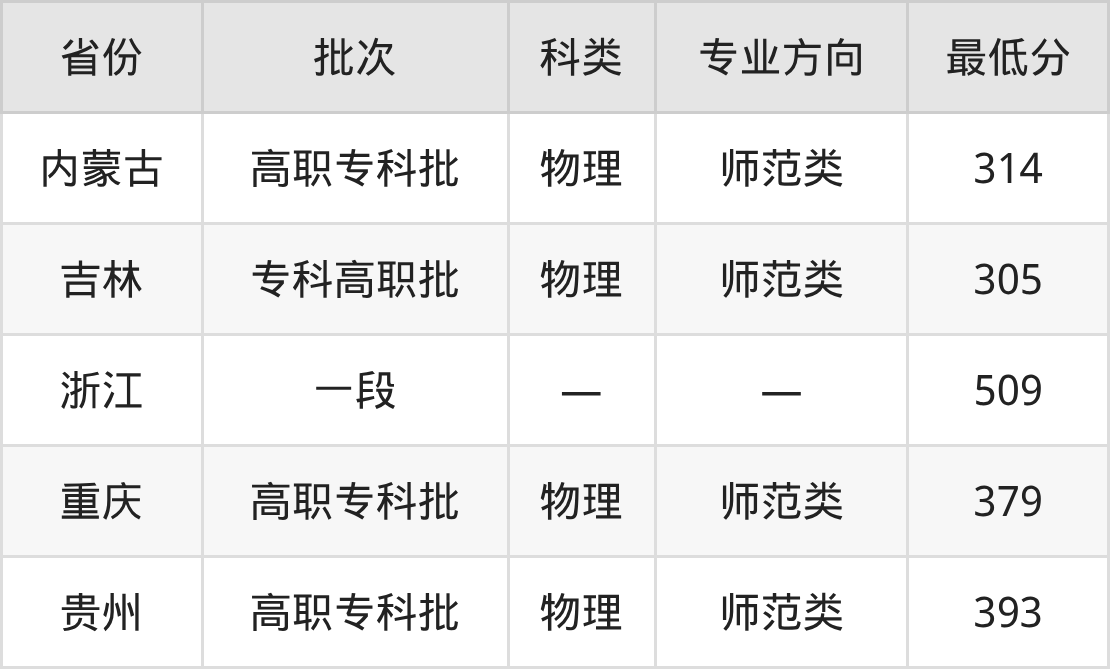 江西师范高等专科学校小学数学教育专业在全国各省最低录取分数线为305分(吉林物理类),除此之外,在其余地区的最低分为浙江509分、重庆物理类379分、贵州物理类393分、内蒙古物理类314分等,以上数据均为2025年数据,供2026年高考生参考。