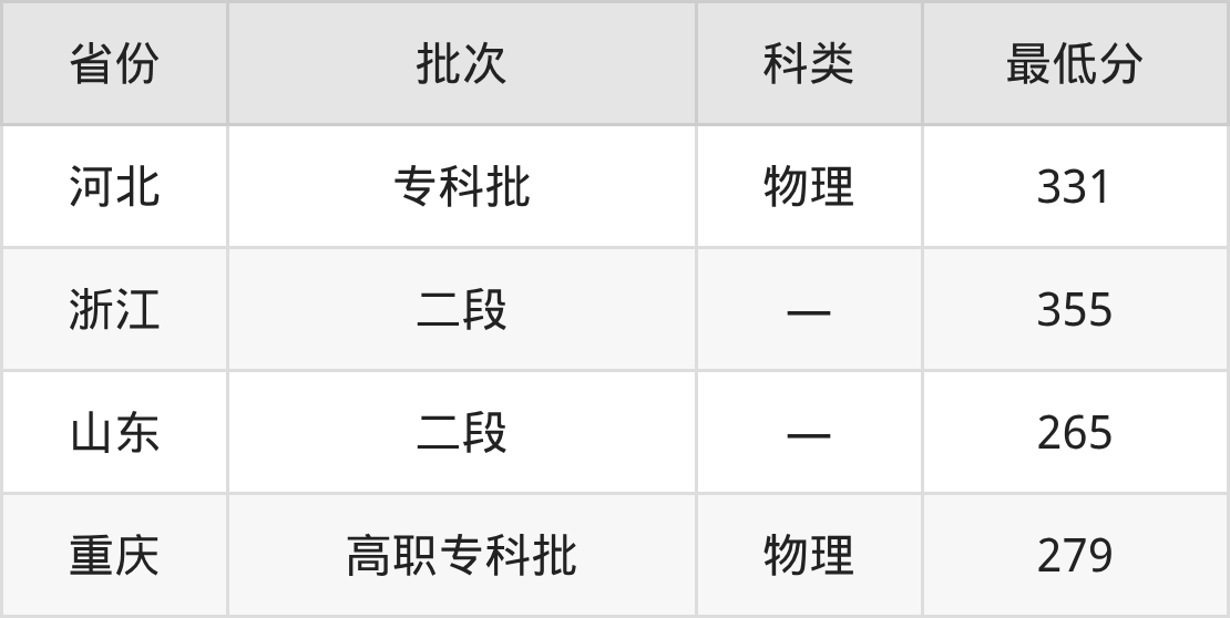 长江艺术工程职业学院物联网应用技术专业在全国各省最低录取分数线为265分(山东),除此之外,在其余地区的最低分为河北物理类331分、浙江355分、重庆物理类279分,以上数据均为2025年数据,供2026年高考生参考。