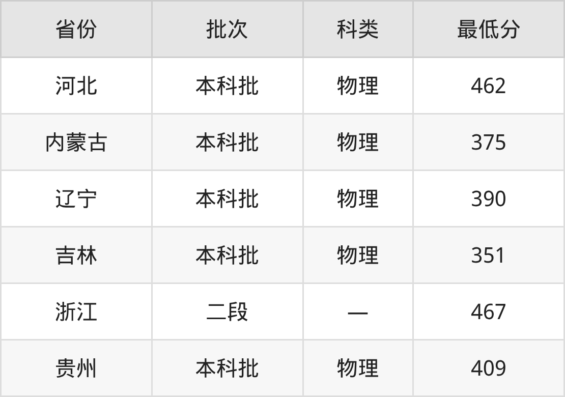长春大学旅游学院数据科学与大数据技术专业在全国各省最低录取分数线为351分(吉林物理类),除此之外,在其余地区的最低分为河北物理类462分、内蒙古物理类375分、辽宁物理类390分、浙江467分等,以上数据均为2025年数据,供2026年高考生参考。
