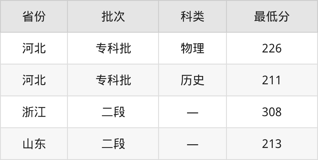 衡阳理工职业学院护理专业在全国各省最低录取分数线为211分(河北历史类),除此之外,在其余地区的最低分为浙江308分、山东213分,以上数据均为2025年数据,供2026年高考生参考。