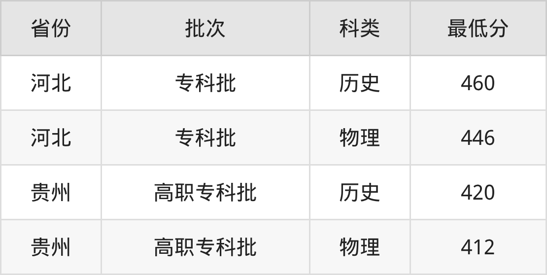 河南护理职业学院医学检验技术专业在全国各省最低录取分数线为412分(贵州物理类),除此之外,在其余地区的最低分为河北物理类446分,以上数据均为2025年数据,供2026年高考生参考。