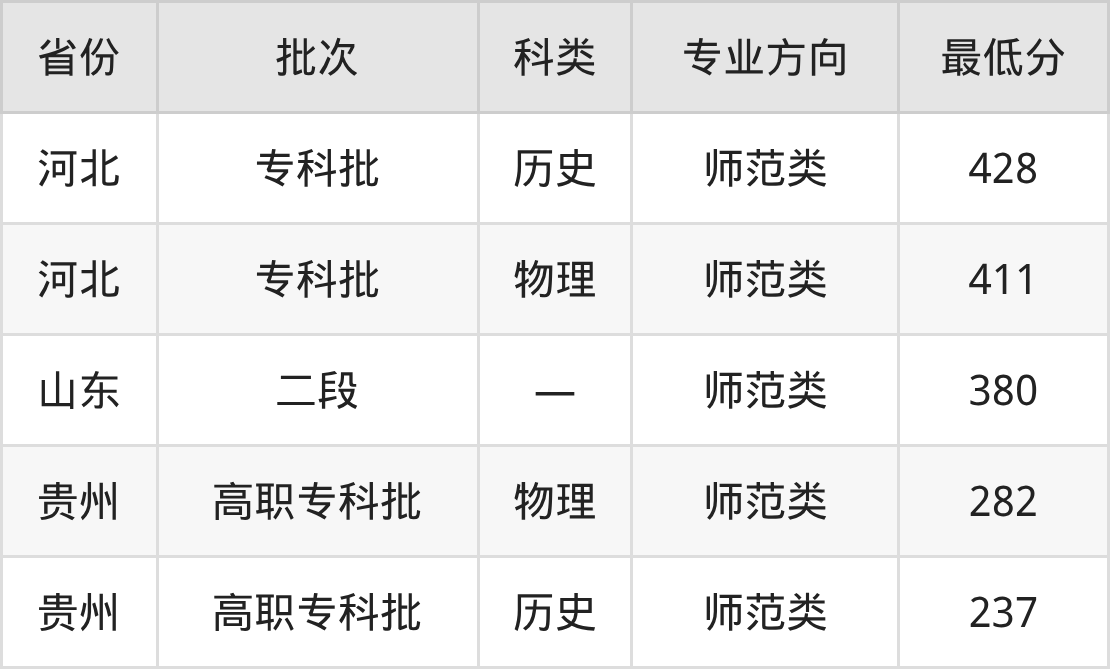 郑州幼儿师范高等专科学校学前教育专业在全国各省最低录取分数线为237分(贵州历史类),除此之外,在其余地区的最低分为河北物理类411分、山东380分,以上数据均为2025年数据,供2026年高考生参考。