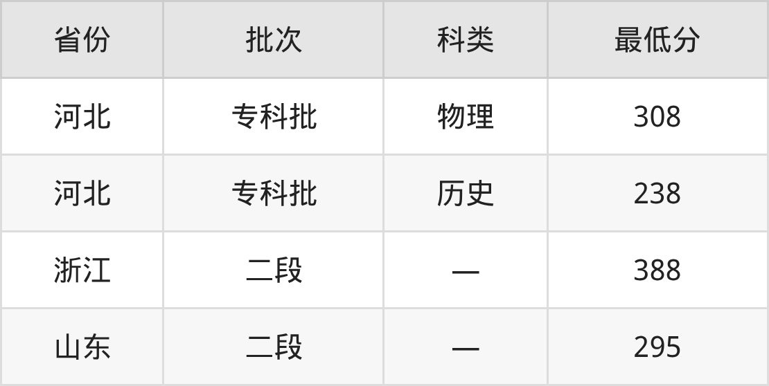 山东工程职业技术大学建筑工程技术专业在全国各省最低录取分数线为238分(河北历史类),除此之外,在其余地区的最低分为浙江388分、山东295分,以上数据均为2025年数据,供2026年高考生参考。