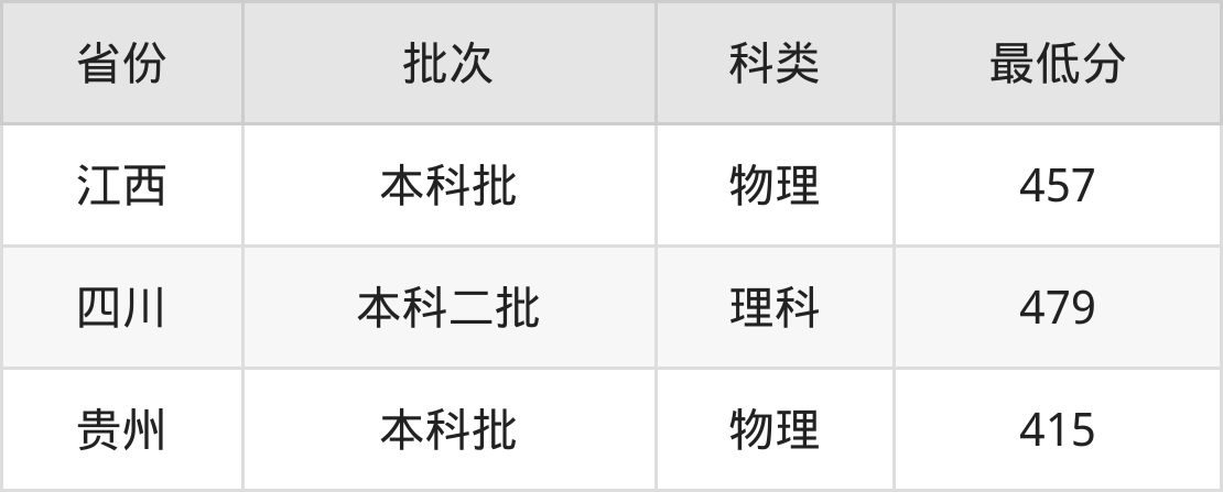 南昌交通学院电子信息工程专业在全国各省最低录取分数线为415分(贵州物理类),除此之外,在其余地区的最低分为江西物理类457分、四川理科479分,以上数据均为2024年数据,供2025年高考生参考。