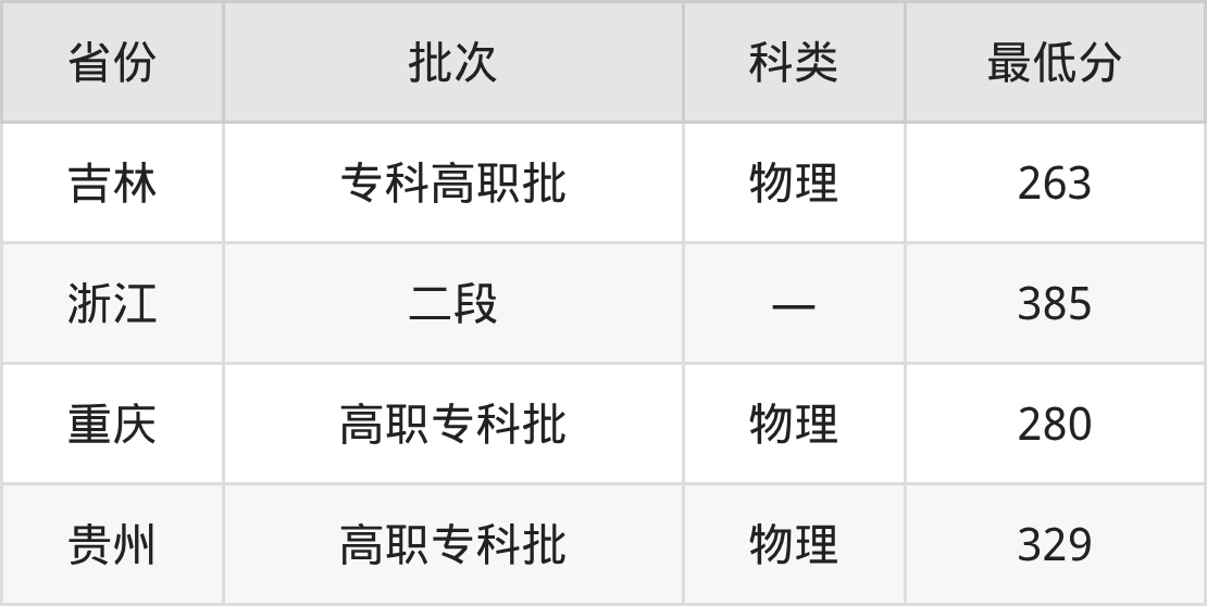 南昌职业大学智能焊接技术专业在全国各省最低录取分数线为263分(吉林物理类),除此之外,在其余地区的最低分为浙江385分、重庆物理类280分、贵州物理类329分,以上数据均为2025年数据,供2026年高考生参考。