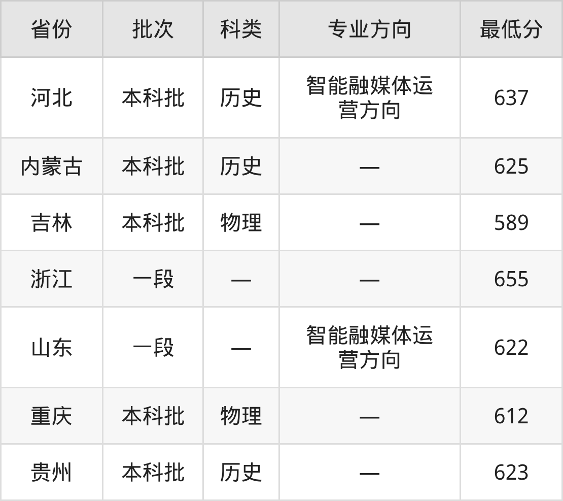 中国传媒大学网络与新媒体专业在全国各省录取分数线: