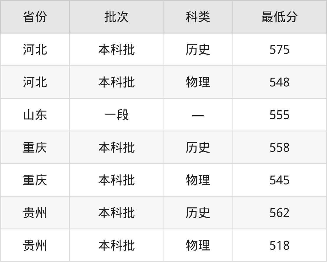 重庆中医药学院中医康复学专业在全国各省最低录取分数线为518分(贵州物理类),除此之外,在其余地区的最低分为河北物理类548分、山东555分、重庆物理类545分,以上数据均为2025年数据,供2026年高考生参考。