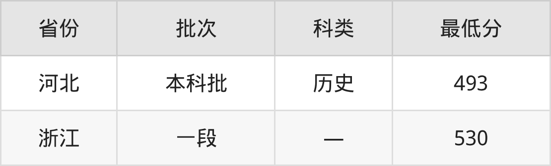 浙江越秀外国语学院西班牙语专业录取分数线从493分到530分不等,最低分数线如下: