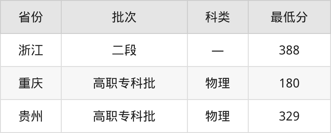 南昌职业大学大数据技术专业在全国各省最低录取分数线为180分(重庆物理类),除此之外,在其余地区的最低分为浙江388分、贵州物理类329分,以上数据均为2025年数据,供2026年高考生参考。