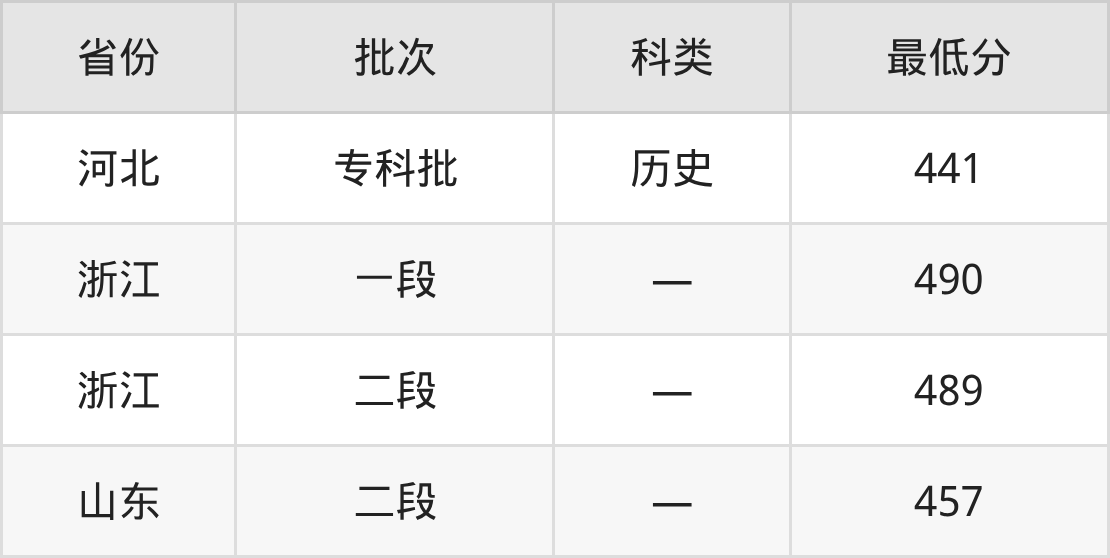 上海行健职业学院应用英语专业在全国各省最低录取分数线为441分(河北历史类),除此之外,在其余地区的最低分为浙江489分、山东457分,以上数据均为2025年数据,供2026年高考生参考。