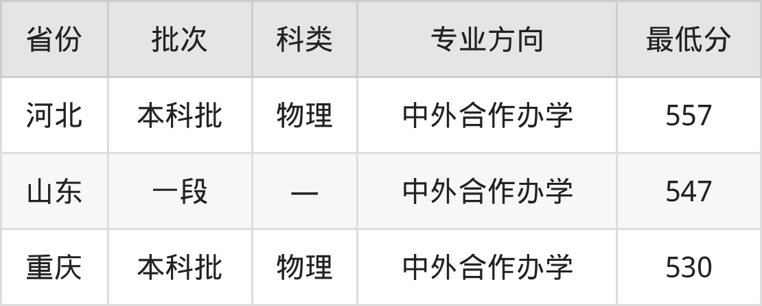 广东以色列理工学院化学工程与工艺专业录取分数线从530分到557分不等,最低分数线如下: