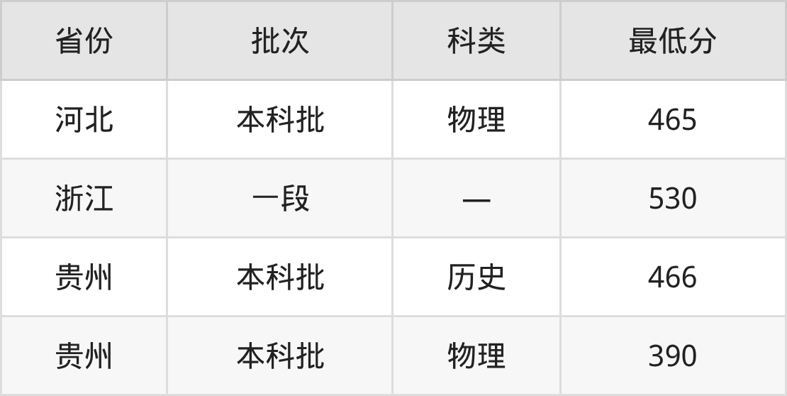 浙江越秀外国语学院酒店管理专业在全国各省最低录取分数线为390分(贵州物理类),除此之外,在其余地区的最低分为河北物理类465分、浙江530分,以上数据均为2025年数据,供2026年高考生参考。