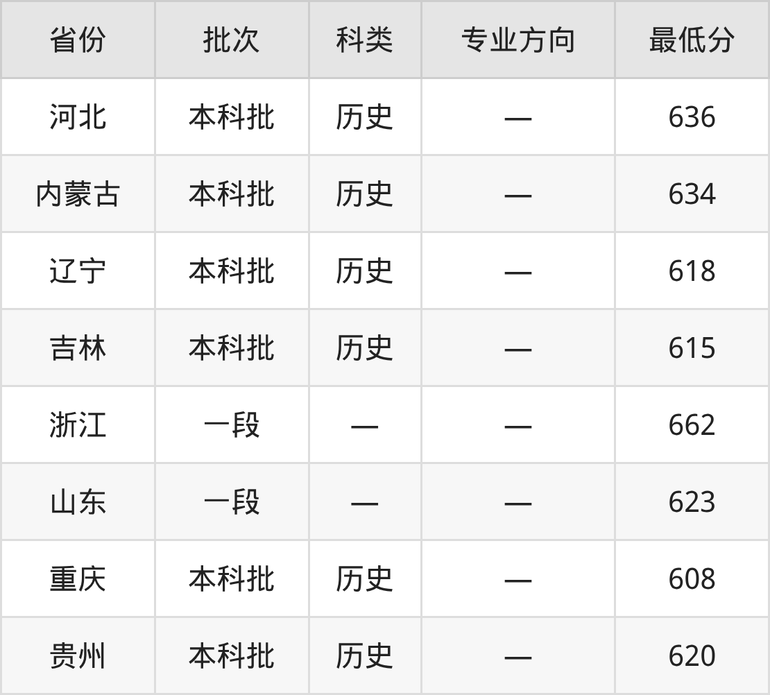 山东大学历史学类专业在全国各省最低录取分数线为608分(重庆历史类),除此之外,在其余地区的最低分为山东623分、贵州历史类620分、河北历史类636分、内蒙古历史类634分等,以上数据均为2025年数据,供2026年高考生参考。