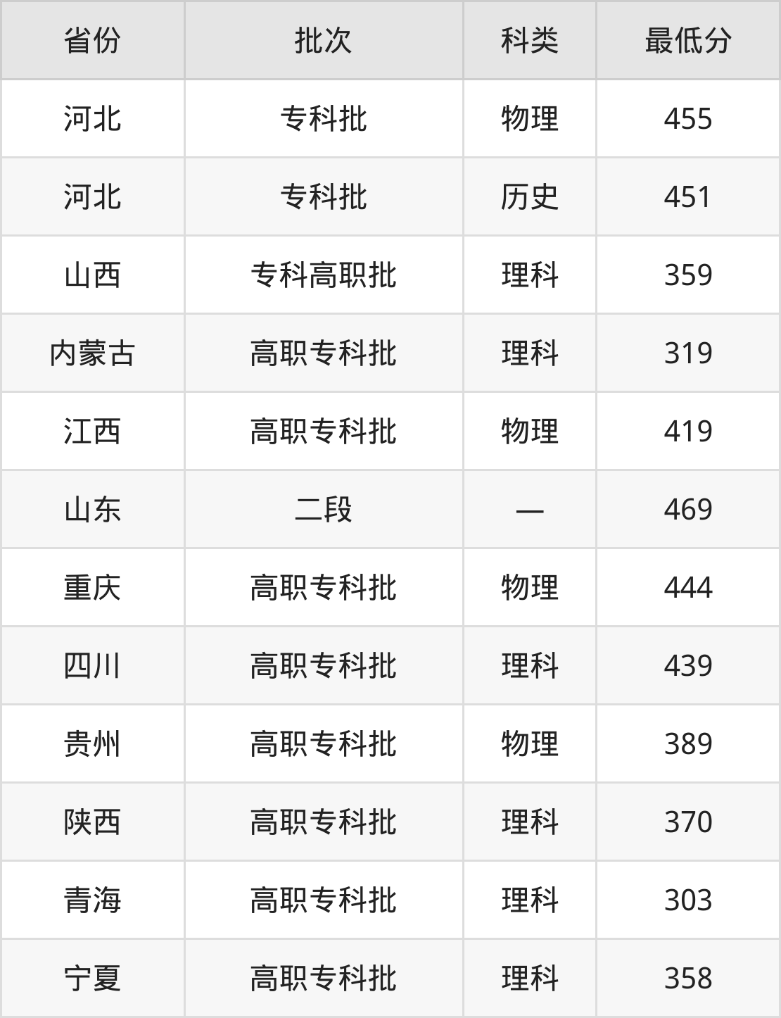 汉中职业技术学院口腔医学专业录取分数线从303分到469分不等,在部分地区的最低分数线如下: