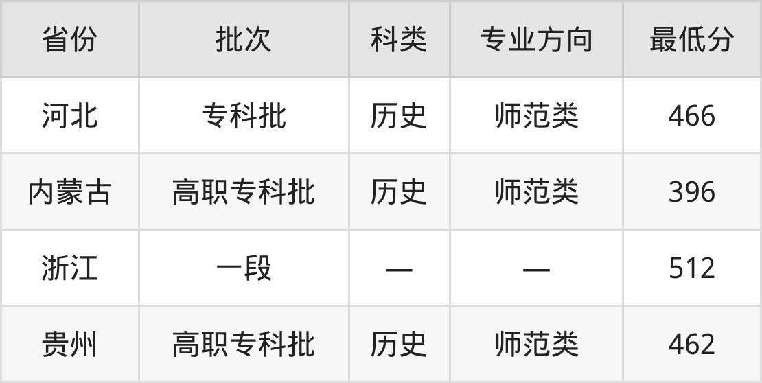 江西师范高等专科学校小学语文教育专业在全国各省最低录取分数线为396分(内蒙古历史类),除此之外,在其余地区的最低分为贵州历史类462分、河北历史类466分、浙江512分,以上数据均为2025年数据,供2026年高考生参考。