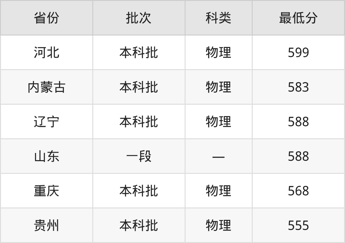 天津工业大学应用物理学专业在全国各省最低录取分数线为555分(贵州物理类),除此之外,在其余地区的最低分为河北物理类599分、内蒙古物理类583分、辽宁物理类588分、山东588分等,以上数据均为2025年数据,供2026年高考生参考。