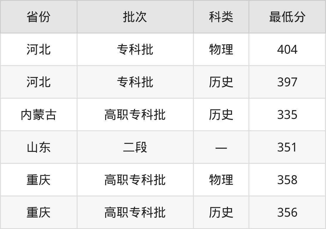 新疆石河子职业技术学院机械制造及自动化专业录取分数线从335分到404分不等,最低分数线如下: