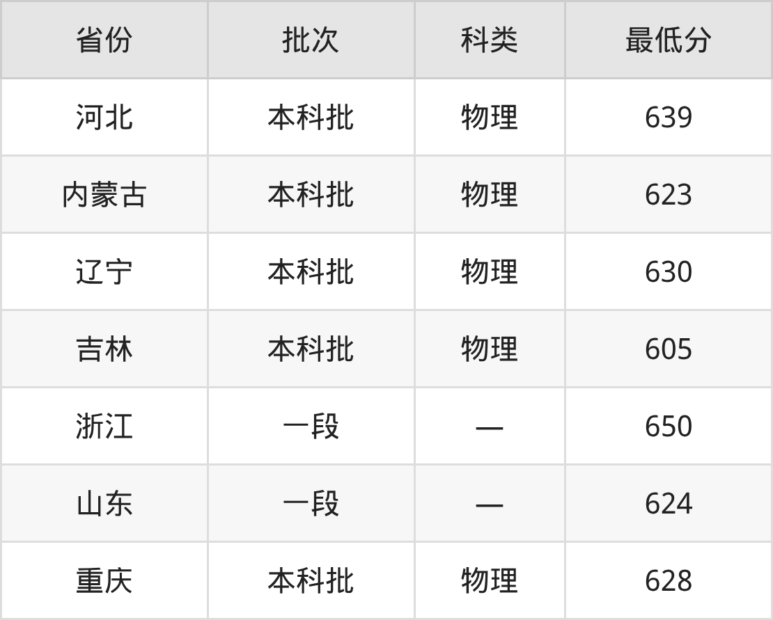 吉林大学空间信息与数字技术专业在全国各省最低录取分数线为605分(吉林物理类),除此之外,在其余地区的最低分为河北物理类639分、内蒙古物理类623分、辽宁物理类630分、浙江650分等,以上数据均为2025年数据,供2026年高考生参考。