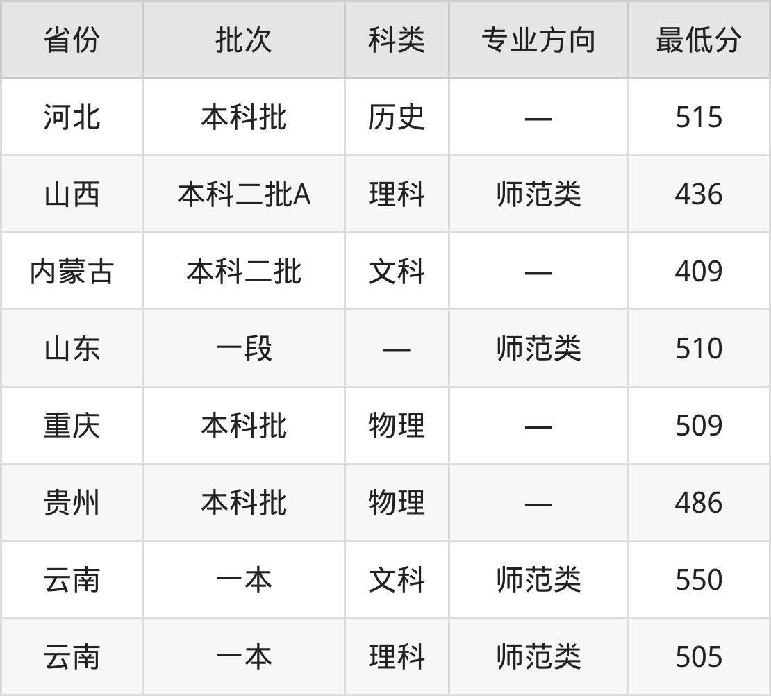 玉溪师范学院小学教育专业录取分数线从409分到550分不等,最低分数线如下: