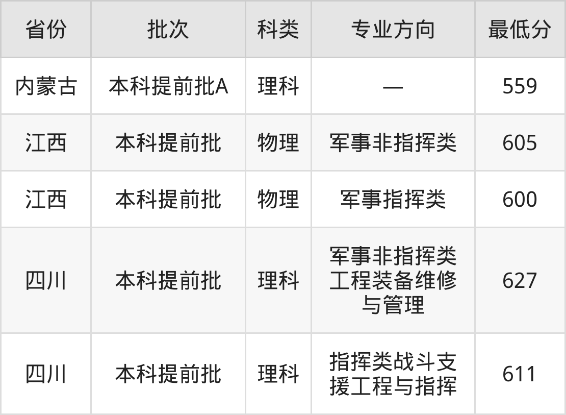 陆军工程大学机械工程专业在全国各省录取分数线: