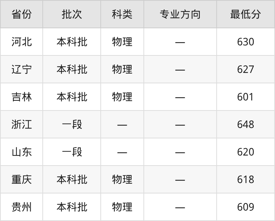 华东理工大学数学类专业在全国各省最低录取分数线为601分(吉林物理类),除此之外,在其余地区的最低分为河北物理类630分、辽宁物理类627分、浙江648分、山东620分等,以上数据均为2025年数据,供2026年高考生参考。