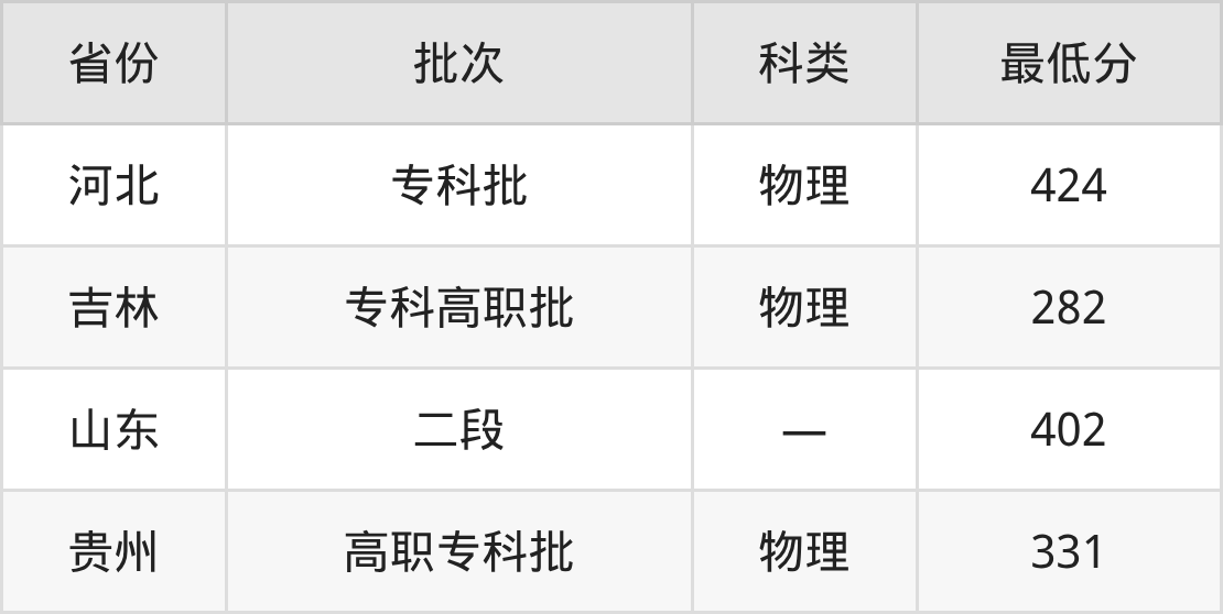 大兴安岭职业学院飞机机电设备维修专业在全国各省最低录取分数线为282分(吉林物理类),除此之外,在其余地区的最低分为贵州物理类331分、河北物理类424分、山东402分,以上数据均为2025年数据,供2026年高考生参考。