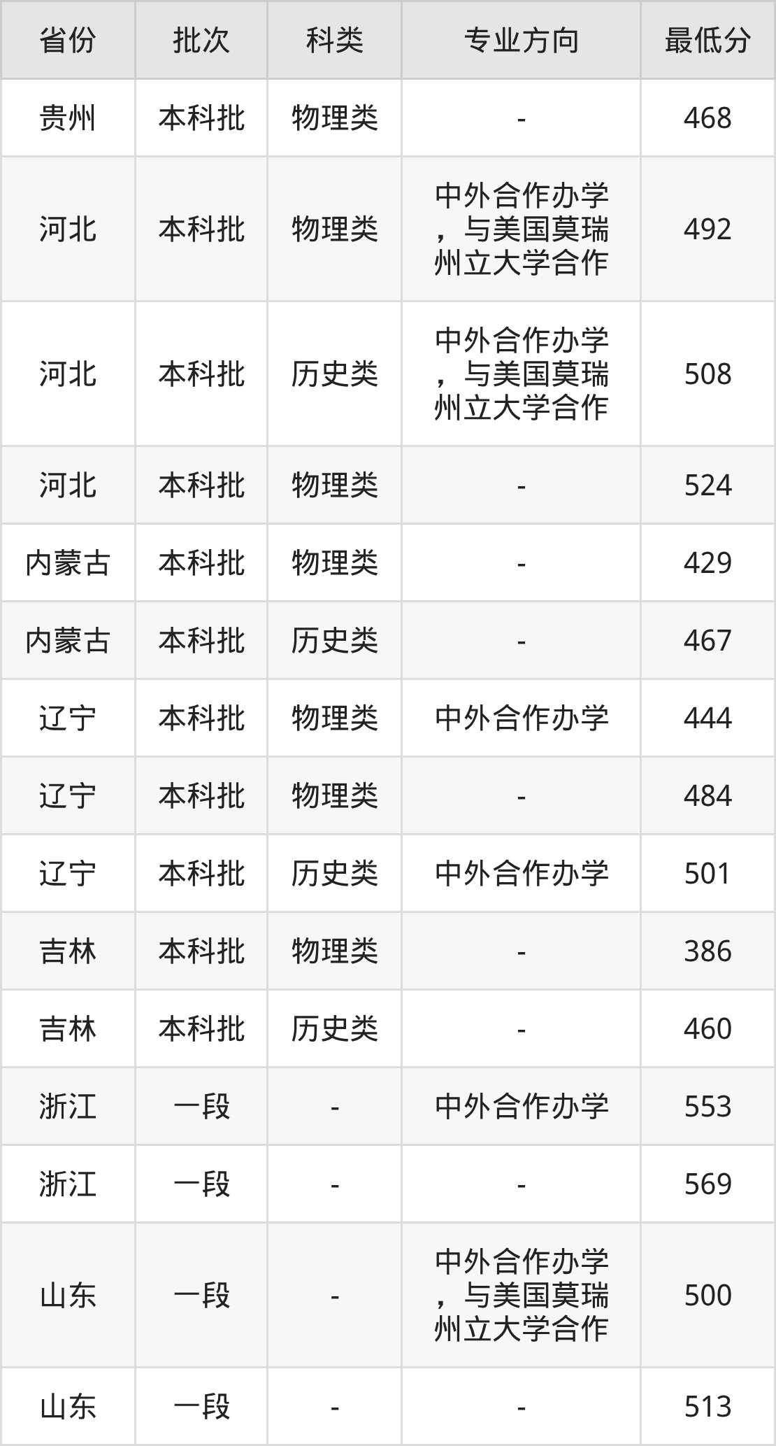 物理类492分(中外合作办学,与美国莫瑞州立大学合作、位次173920名),历史类508分(中外合作办学,与美国莫瑞州立大学合作、位次44877名),物理类524分(位次120435名)。