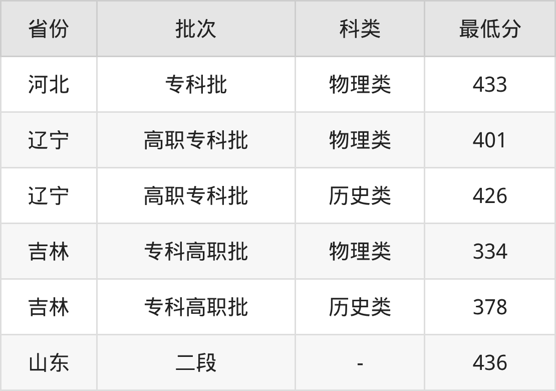 黑龙江司法警官职业学院司法警务专业录取分数线2025各省汇总显示,省外招生最低分为河北433分、辽宁401分、吉林334分、山东436分。更多专业分数详情、选科要求、专业简介等均可在正文查阅。